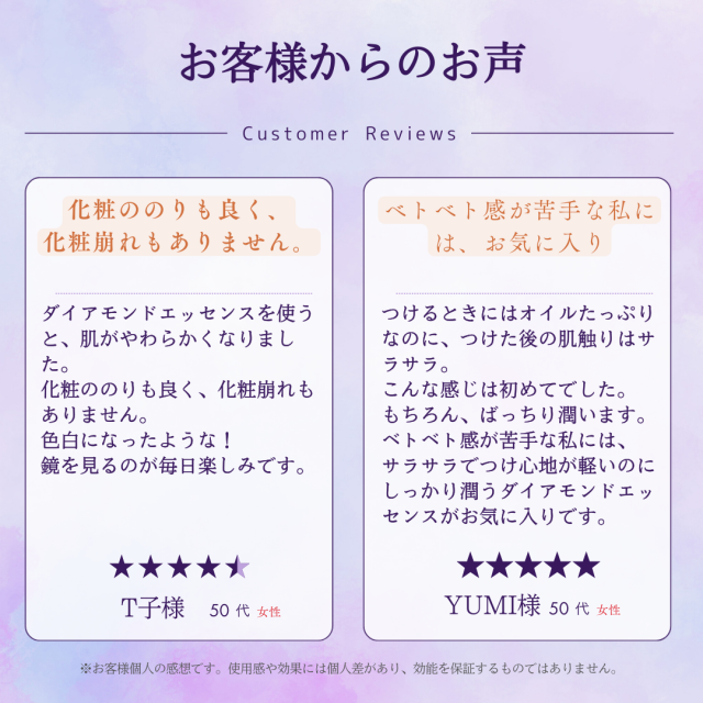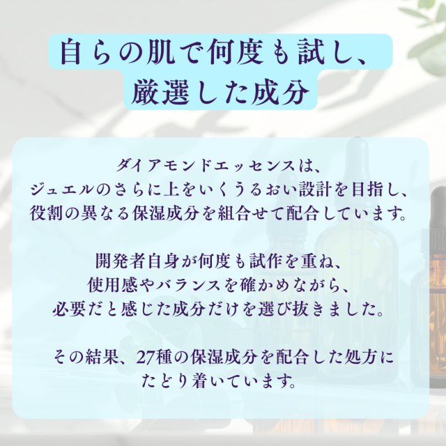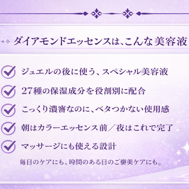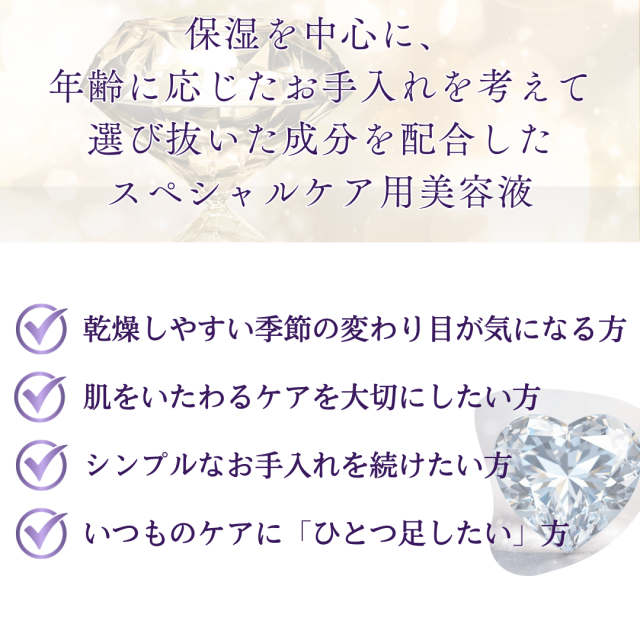 保湿成分、エイジングケア成分ダイアモンドエッセンスを凝縮した濃密な美容液です。