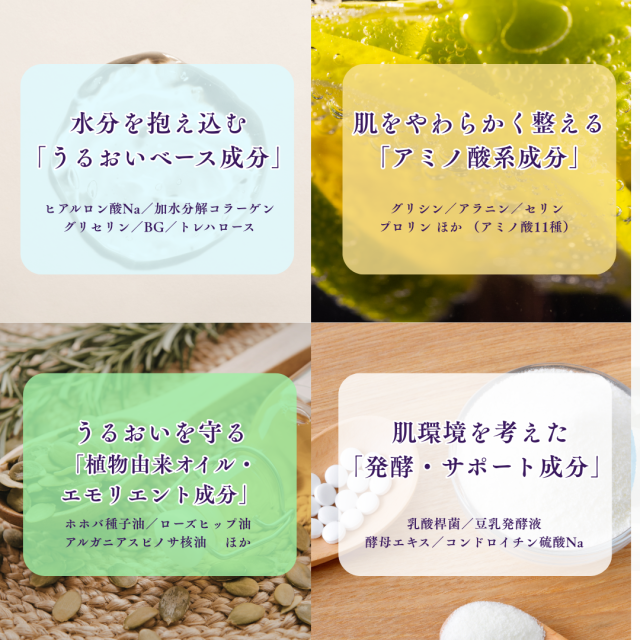 水、ジメチコン、シクロペンタシロキサン、パルミチン酸エチルヘキシル、グリセリン、(ジメチコン/(PEG-10/15))クロスポリマー、ペンチレングリコール、ジイソステアリン酸プロパンジオール、ジグリセリン、(ジメチコン/ビニルジメチコン)クロスポリマー、ダイヤモンド末、ジ酢酸ジペプチドジアミノブチロイルベンジルアミド、乳酸桿菌/乳発酵液(牛乳)、シルク、サッカロミセス溶解質エキス、コメエキス、ホホバ種子油、コンドロイチン硫酸Na、ヒアルロン酸Na、ローズヒップ油、リシンHCI、グルタミン酸、グリシン、ロイシン、ヒスチジンHCI、セリン、バリン、アスパラギン酸Na、トレオニン、アラニン、イソロイシン、アラントイン、フェニルアラニン、アルギニン、プロリン、チロシン、イノシン酸2Na、グアニル酸2Na、スクワラン、マカデミアナッツ油、オリーブ油、ビターオレンジ花油、ビャクダン油、アセチルペンタペプチド-35、シリカ、デキストリン、BG、フェノキシエタノール