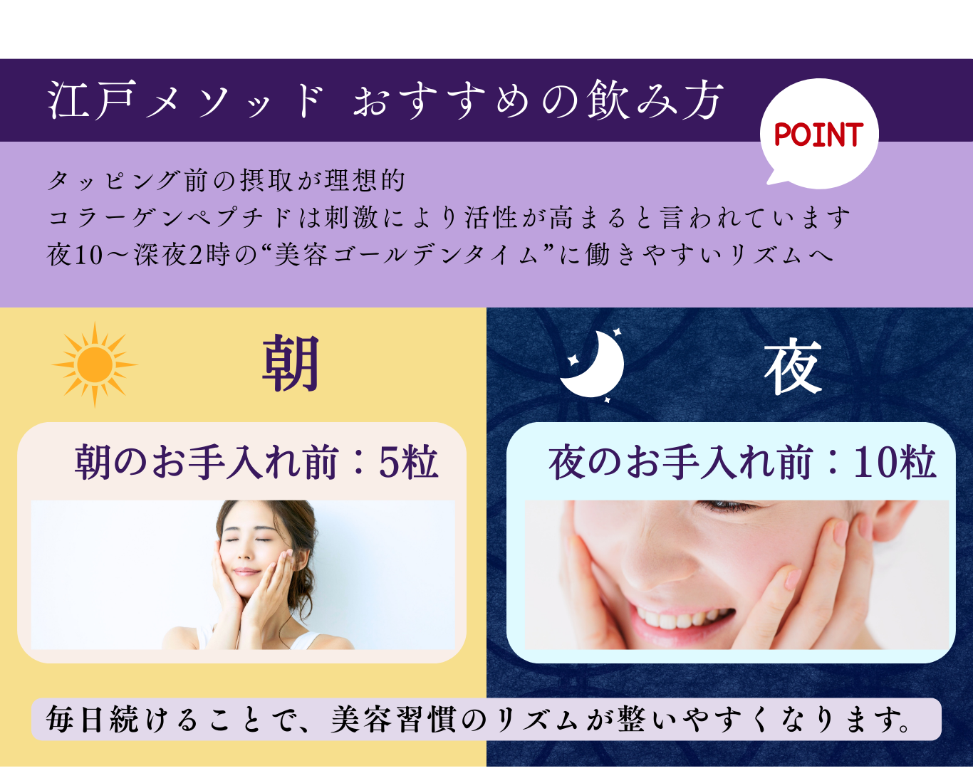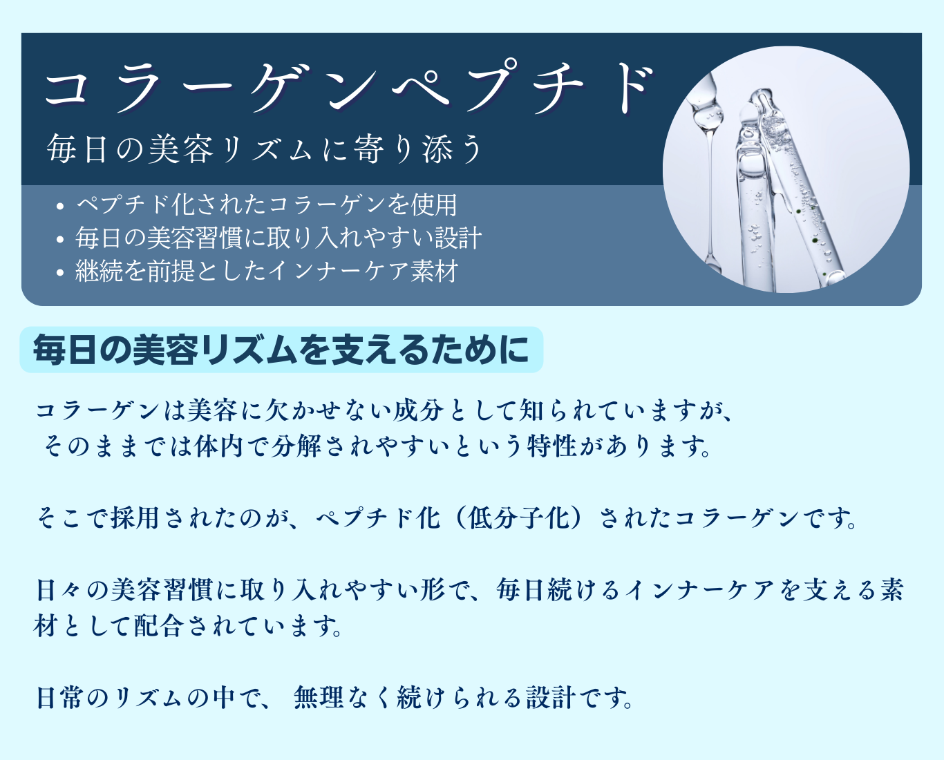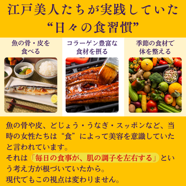 15粒あたり、コラーゲンペプチド2,000mg、姫マツタケ(岩出101株)1,000mg配合、L-シスチン200mg配合。