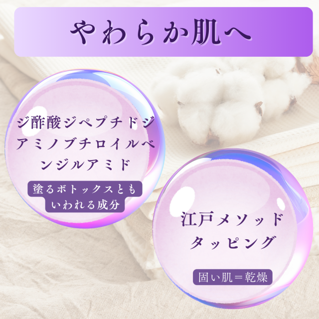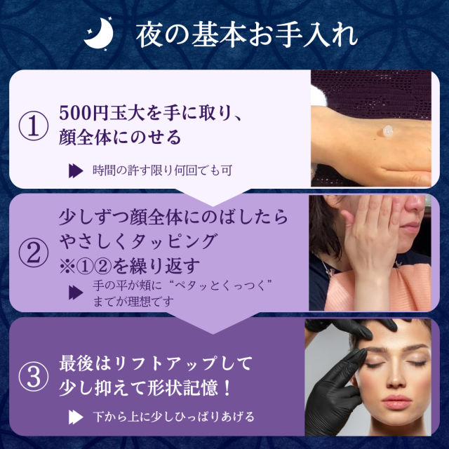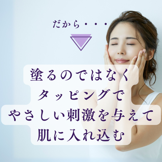 〇 洗顔後、朝は真珠2~3粒大、夜は3~4粒大をタッピングしてなじませます。