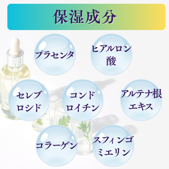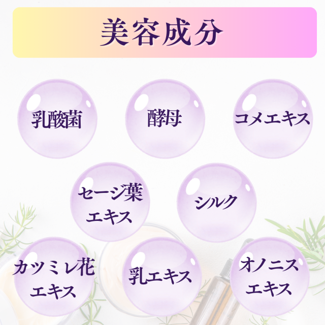 水、BG、グリセリン、スクワラン、プラセンタエキス、ジ酢酸ジペプチドジアミノブチロイルベンジルアミド、乳酸桿菌/乳発酵液(牛乳)、コメエキス、乳エキス、スフィンゴミエリン、乳糖、テトラヘキシルデカン酸アスコルビル、セレブロシド、トコフェロール、ヒアルロン酸Na、加水分解コラーゲン、コンドロイチン硫酸Na、シルク、サッカロミセス溶解質エキス、アルギニン、セイヨウノコギリソウエキス、セージ葉エキス、カミツレ花エキス、アルテア根エキス、タチジャコウソウ花/葉/茎エキス、メリッサ葉エキス、オノニスエキス、スギナエキス、セロリ茎エキス、フキタンポポ花エキス、尿素、水添レシチン、水酸化レシチン、カルボマー、ペンチレングリコール、フェノキシエタノール